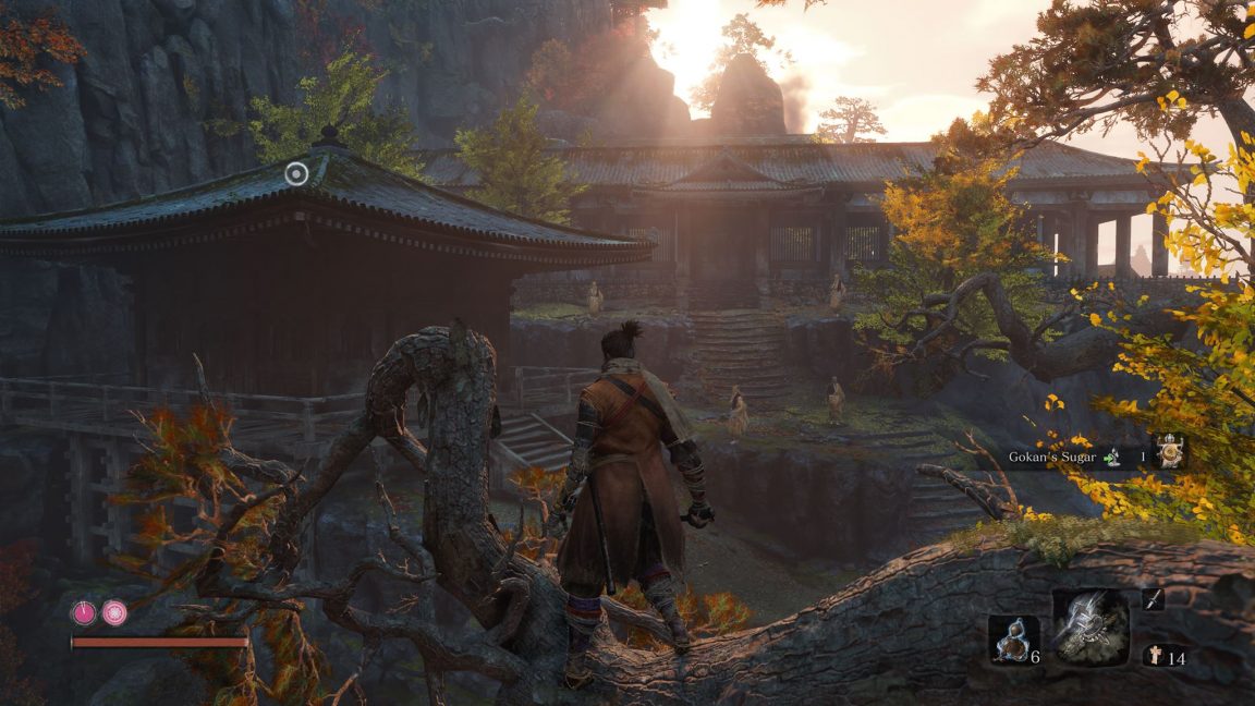 You play as a shinobi pledged to a young lord during Japan’s Sengoku period. Your mission is to get him back from the bad guys who snatched him away. Being a FromSoftware game, there are also themes of death and rebirth, lifeforce, and mythos that I won’t spoil here. The difference is, this time the protagonist is an actual character with a voice, and the story is told via dialogue and cutscenes rather than only relying on esoteric item descriptions and environmental details (though there’s some of that, too).