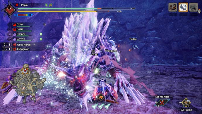 They’re introduced in a simple enough way; you churn through the Master Rank quests in Sunbreak as you would any other Monster Hunter setup, getting to fight bigger and more dangerous prey as you level up. Then, with one urgent quest, the definitely-not-a-dominatrix royal vanguard, Fiorayne, decides to accompany you – there’s a very dangerous monster out there, and some feckless newcomer surely can’t deal with it alone.